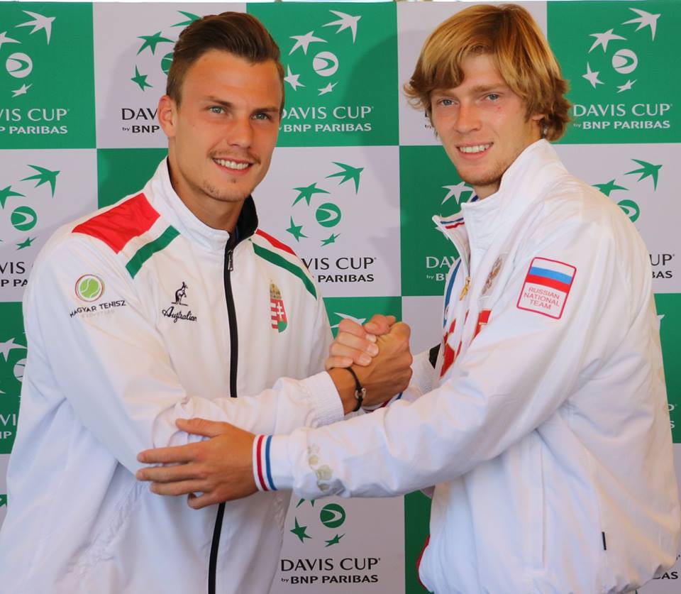 A nyitómeccset a nyíregyházi Fucsovics Márton (113.) vívhatta az ellen az Andrej Rubljov ellen, aki a világranglistán a 37. helyen áll. Marci nagyszerűen kezdett, irányította az első játszmát, az orosz pedig nem találta az ellenszert. A második szettet is nyerte a magyar válogatott elsőszámú játékosa, és ekkor már érett a meglepetés. A folytatásban viszont Rubljov a játszma elején komoly előnyt szerzett, Fucsovics Márton azonban elvette adogatását, majd hozta a sajátját, így ismét szoros lett a meccs. Sajnos 5-5 után az orosz volt pontosabb, így végül nagy csatában nyerte a harmadik szettet. A negyedikben sok volt a hiba Marci oldalán, és sokan már hullámvölgyről beszéltek, de a nyíregyházi teniszező mindenkire rácáfolt a döntő játszmában! Gyorsan elvette ellenfele adogatását, és bár Rubljov egyenlített, ismét jött egy break Marcitól. Majd mégegy, így hatalmas csatában, 3-2-re nyerte a nyitómeccset a magyar játékos három és fél óra alatt. A válogatott ezzel 1-0-ra vezet!
