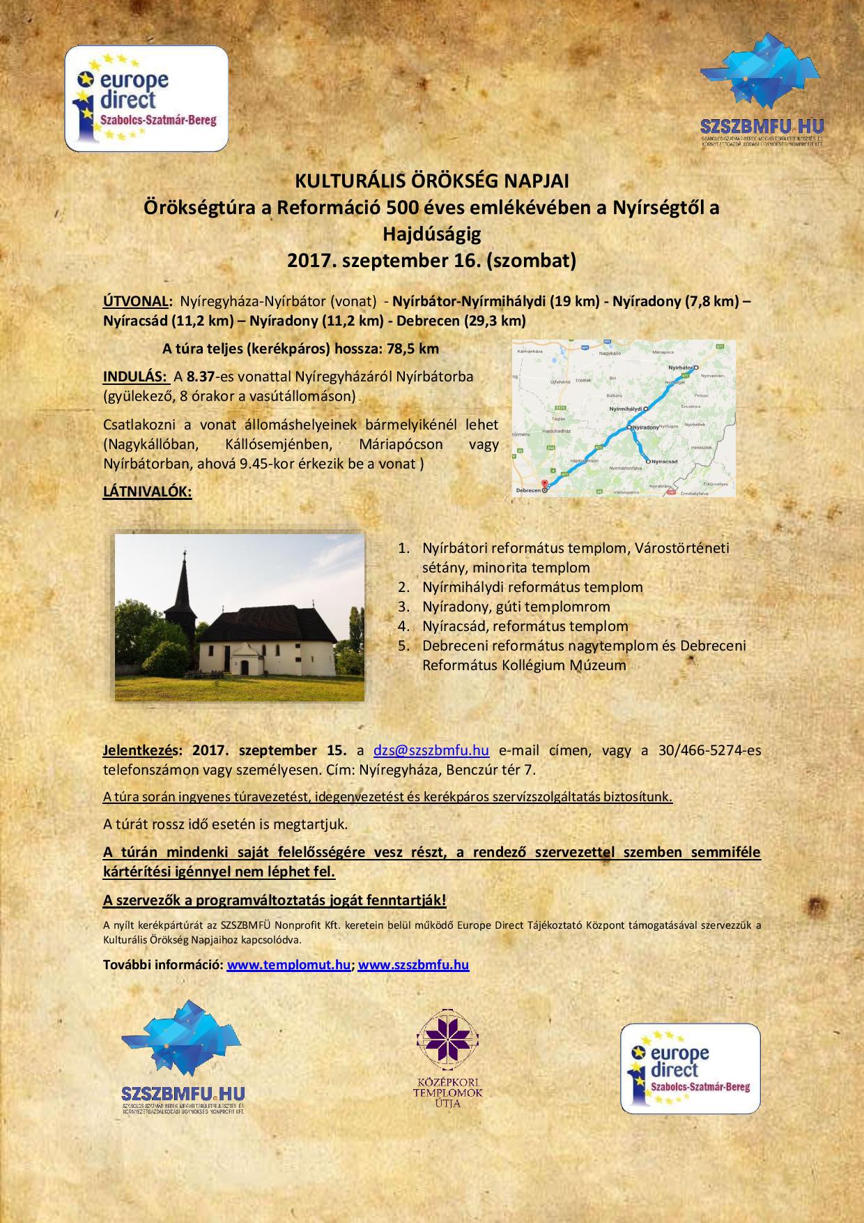 Örökségtúra a Reformáció 500 éves emlékévében a Nyírségtől a Hajdúságig.Ahhoz a nagyszabású örökségvédelmi kezdeményezéshez csatlakozik az SZSZBMFÜ Nonprofit Kft. és a keretein belül működő Europe Direct Tájékoztató Iroda az idei utolsó örökségtúrával, amelyet a világ majdnem 50 országában, ugyanabban az időpontban vagyis a szeptember 16-i hétvégén rendeznek meg. A Kulturális Örökség Napjai rendezvényének célja ugyanis megismertetni és közelebb vinni az európai polgárokat kulturális örökségükhöz, felhívni a figyelmet az örökség folyamatos megőrzésére, védelmére, más közösségek kulturális értékeinek, műemlékeinek megismertetésére, felfedezésére. Évente más-más a tematika, idén a reformáció 500 éves évfordulója adja a rendezvény aktualitását, melyhez csatlakozik a Középkori templomok útja program is, hiszen a templomút nagy részét középkori eredetű református templomok alkotják. Ezúttal is jelentős örökséghelyszíneket keresünk fel, a Nyírség és a hajdú vidék útjain haladva. A kerékpáros örökségtúra Nyírbátorból indul, ahol Magyarország legszebb késő gótikus, reneszánsz és barokk stílusjegyeket őrző emlékeit, a nyírbátori református és minorita templom a legelbűvölőbb látnivaló. A nyírmihálydi református templom a következő megállóhely, melynek igazi kuriózumát az adja, hogy ördögöt festettek a falra…Ezt követően Nyíradony határában a gúti erdő közepén fekvő román kori gúti templomrom és a nyíracsádi református templom káprázatos falképeit csodálhatják meg a túra résztvevői. Az örökségtúra utolsó állomása a „kálvinista Róma”, azaz Debrecen, ahol a reformáció legszebb magyar emlékeivel és történéseivel ismerkedhet meg a remélhetően minél nagyobb számú csapat a református nagytemplom- és múzeum falai között.