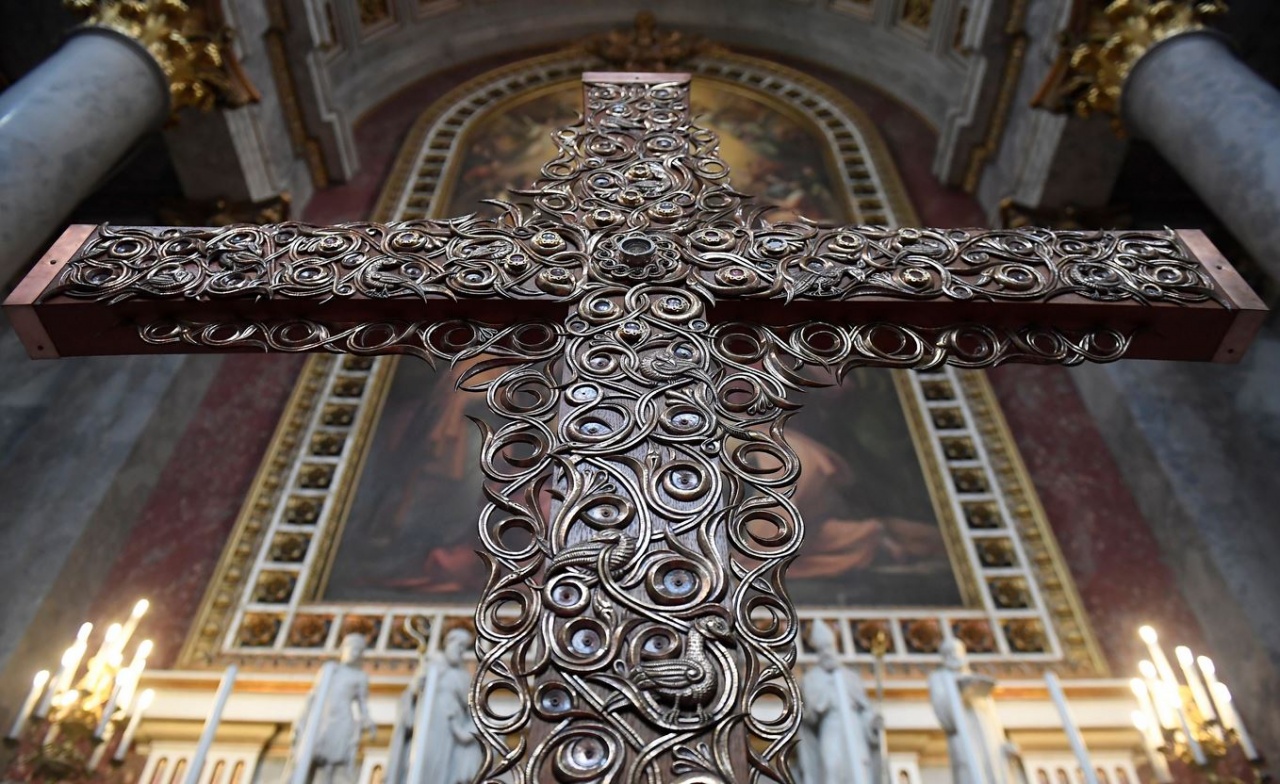 Az Eucharisztikus Világkongresszus missziós keresztje az esztergomi bazilikában 2018. február 24-én. A keresztet, amelyet Erdő Péter bíboros, prímás, esztergom-budapesti érsek megáldott, március 2-án indítják útjára, a 2020-as budapesti Nemzetközi Eucharisztikus Világkongresszusig végigviszik valamennyi egyházmegyében. A három méter magas, bronzborításokkal díszített tölgyfakereszt Ozsvári Csaba ötvösművész (1963-2009) alkotása.