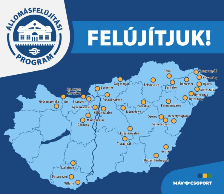 A ma elindított állomásfelújítási program keretében országszerte több mint harminc állomás és megállóhely megújul, köztük: Ács, Aranyosapáti, Balmazújváros, Bashalom, Berettyóújfalu, Demecser, Esztergom-Kertváros, Felsőzsolca, Gárdony, Gyula, Győrasszonyfa, Jászberény, Kisvarsány, Kőbánya alsó, Leányvár, Magyarbánhegyes, Martonvásár, Mátészalka, Nyíradony, Nyírbogát, Ópályi, Pécsudvard, Poroszló, Püspökhatvan, Sárrétudvari, Salgótarján, Szalatnak, Szerep, Tiszaalpár, Tiszajenő alsó, Tokaj és Villány.