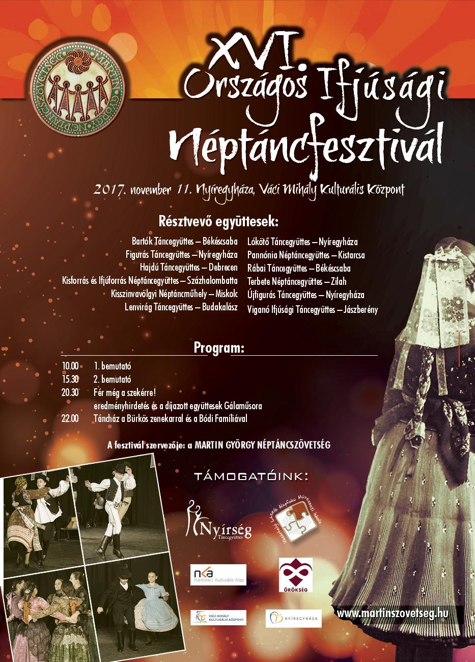 A Martin György Néptáncszövetség Nyíregyházán rendezi meg a XVI. ORSZÁGOS IFJÚSÁGI NÉPTÁNCFESZTIVÁLT 2017. november 11-én a Váci Mihály Kulturális Központban.