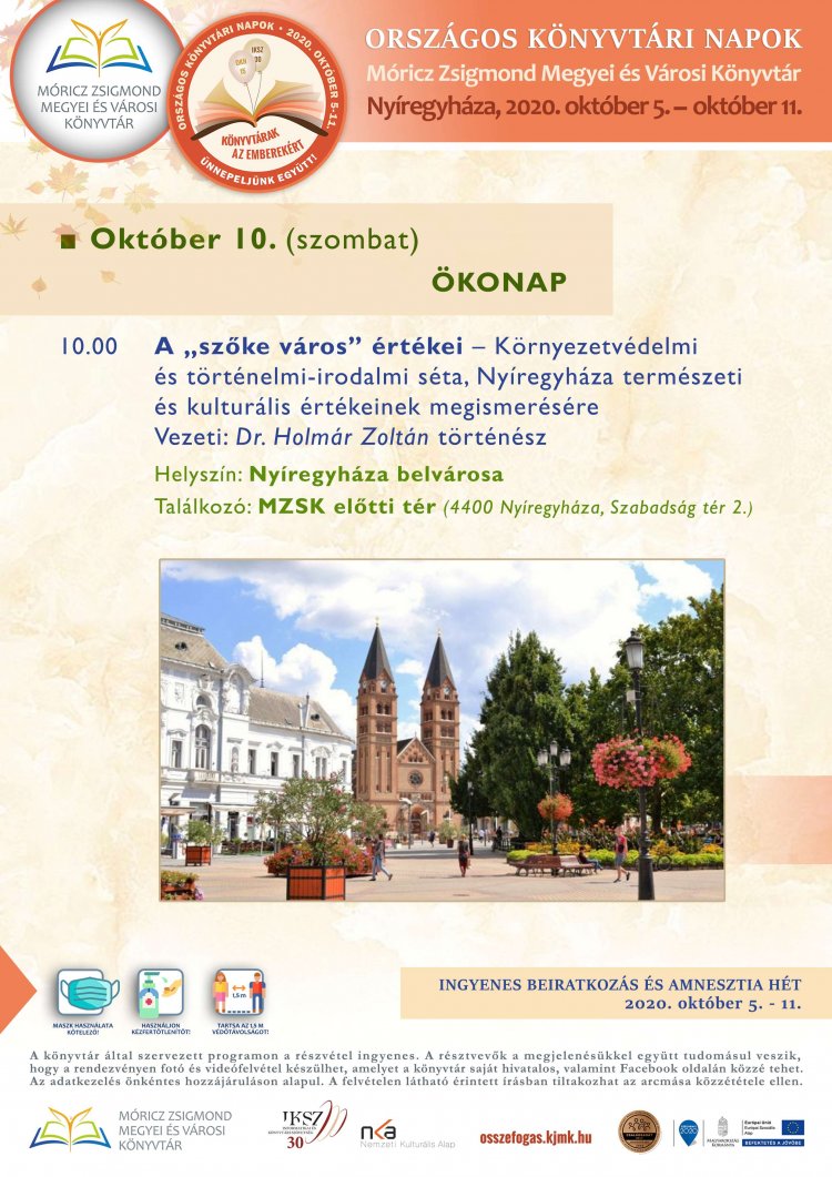 Dr. Holmár Zoltán történész vezetésével környezetvédelmi és történelmi-irodalmi sétára invitálják a városlakókat október 10-én. A belvárosi séta a Móricz Zsigmond könyvtár előtti térről indul, 10 órakor.