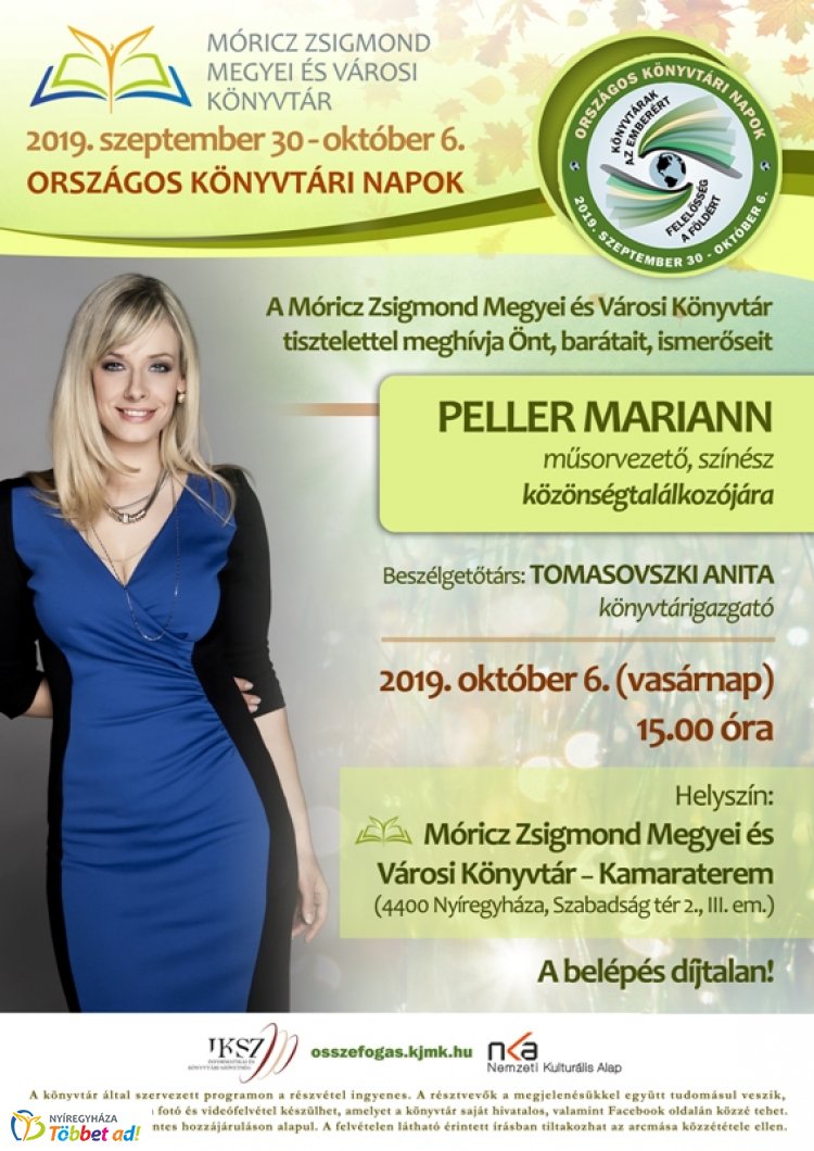 Peller Mariann műsorvezető, színész lesz az Országos Könyvtári Napok vendége október 6-án, a Könyves Vasárnapon. Az érdeklődőket a Móricz Zsigmond könyvtárba várják.