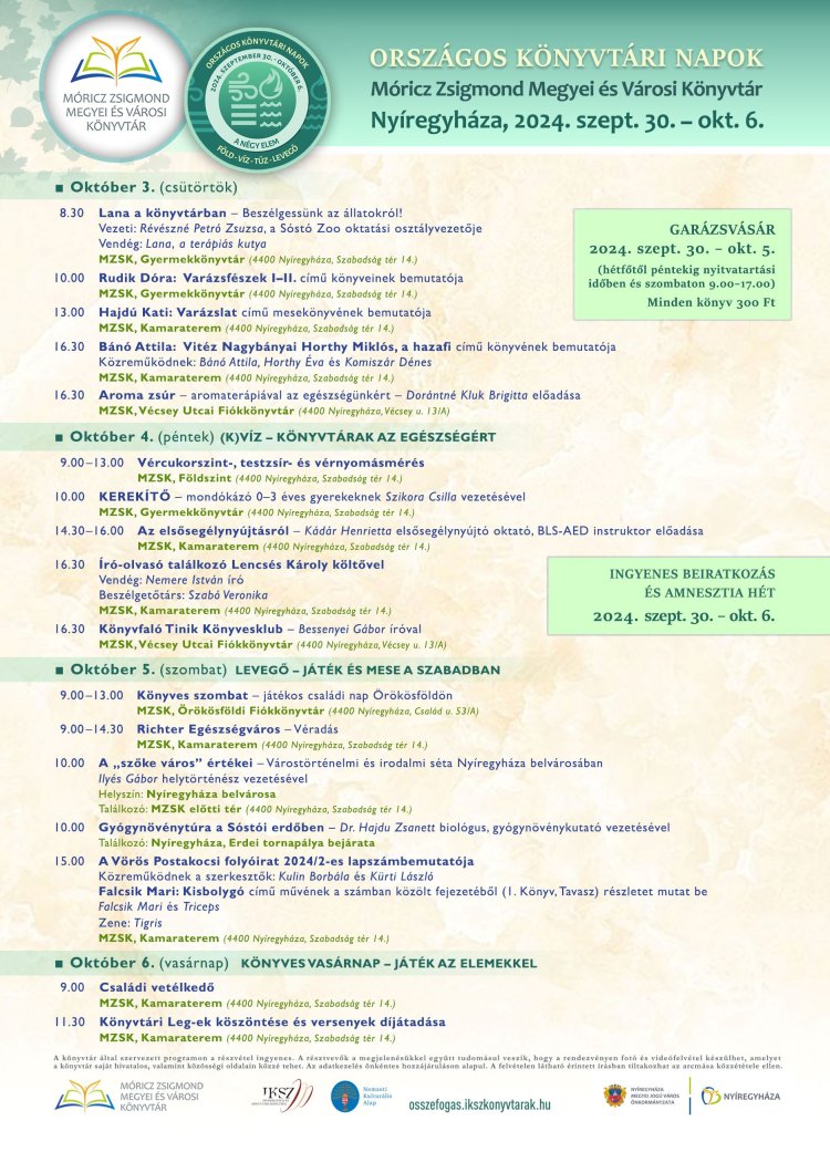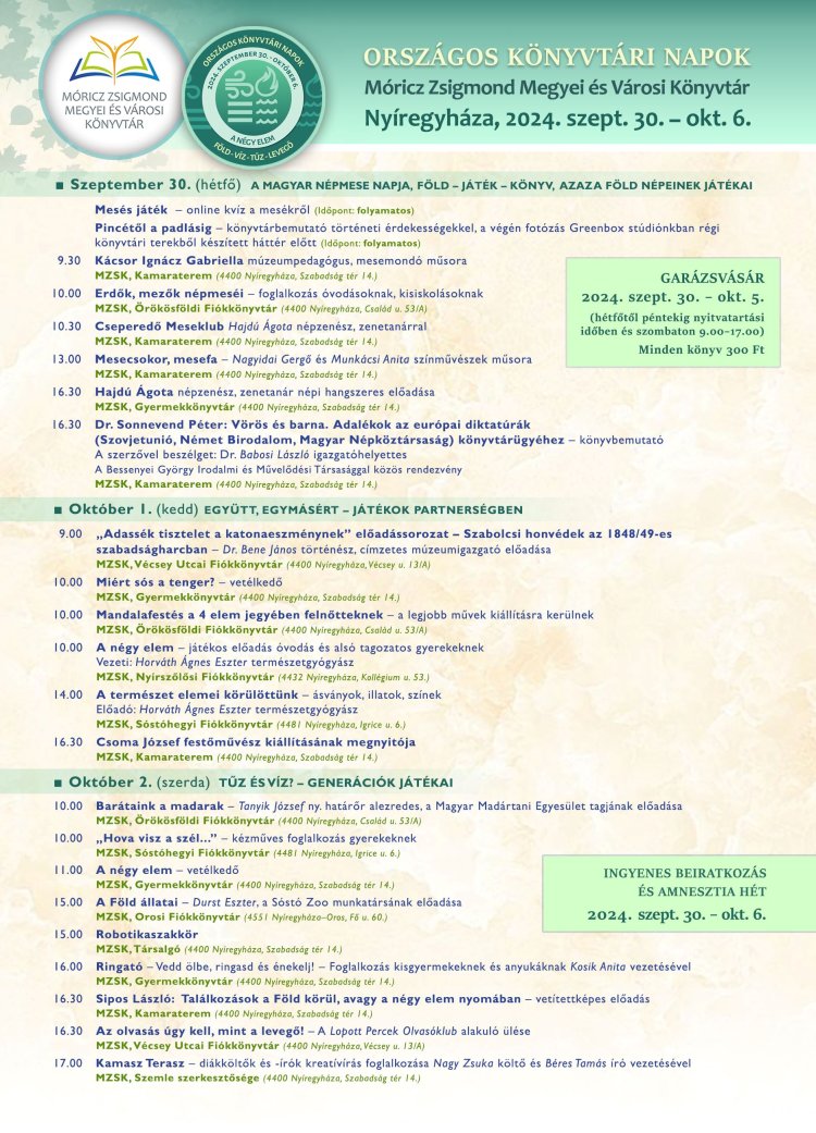 2006-tól minden évben egységes tematika alapján kerül sor az Országos Könyvtári Napok eseményeire. Az évente változó, de egymásra épülő témák, a különböző korosztályok eltérő igényeire és érdeklődésére, a bennünket körülvevő gyors változásokra figyelés tette a szakma legjelentősebb, legtöbb érdeklődőt megmozgató programsorozatává ezt a kiemelt projektet. A Nyíregyházi Móricz Zsigmond Megyei és Városi Könyvtár idén is gazdag programkínálattal várja a könyvtári napok rendezvényeire.