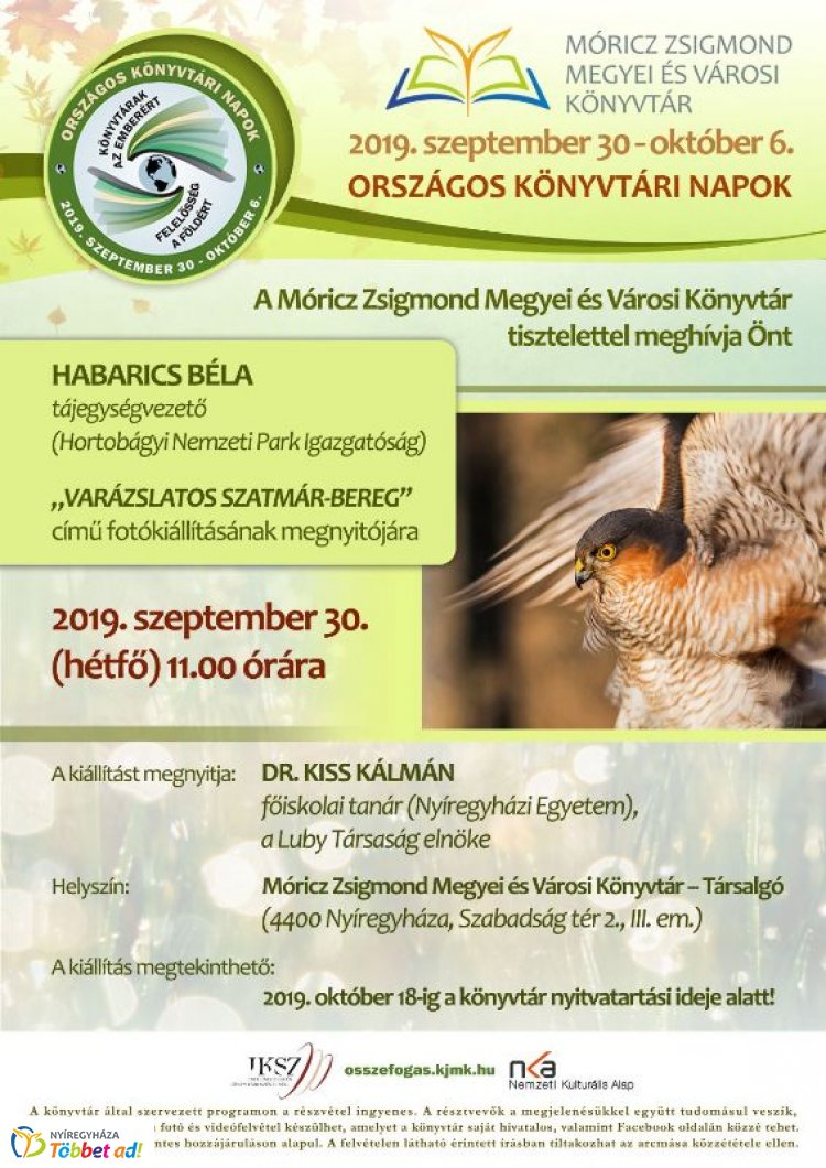 Az Országos Könyvtári Napok keretén belül Habarics Béla, a Hortobágyi Nemzeti Park Igazgatóság tájegységvezetője fotóiból nyílik kiállítás szeptember 30-án a Móricz Zsigmond könyvtár társalgójában.