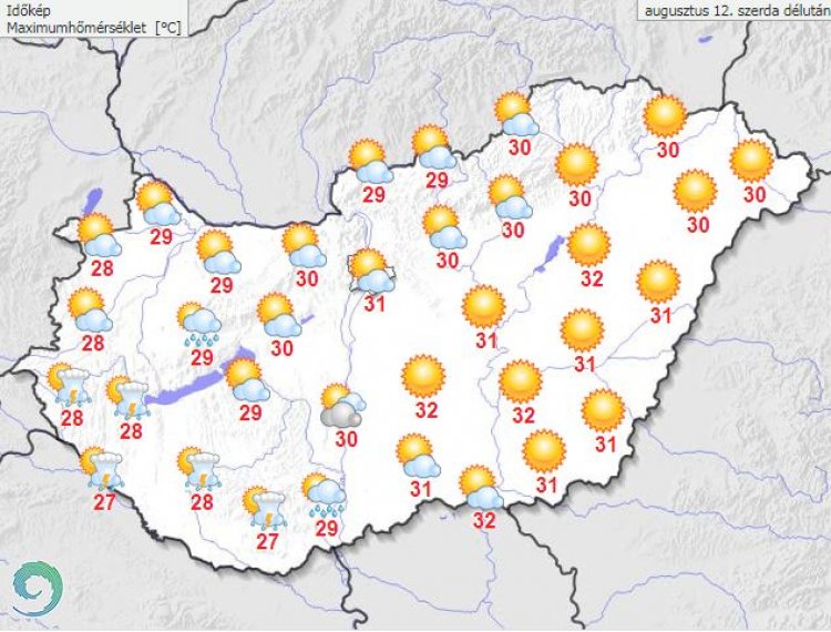 Főként keleten megélénkül az északi, északkeleti szél, zivatarok környezetében azonban erős, viharos széllökések is lehetnek. A legmagasabb nappali hőmérséklet 27 és 32 fok között valószínű. Késő estére általában 18 és 25 fok közé hűl le a levegő.