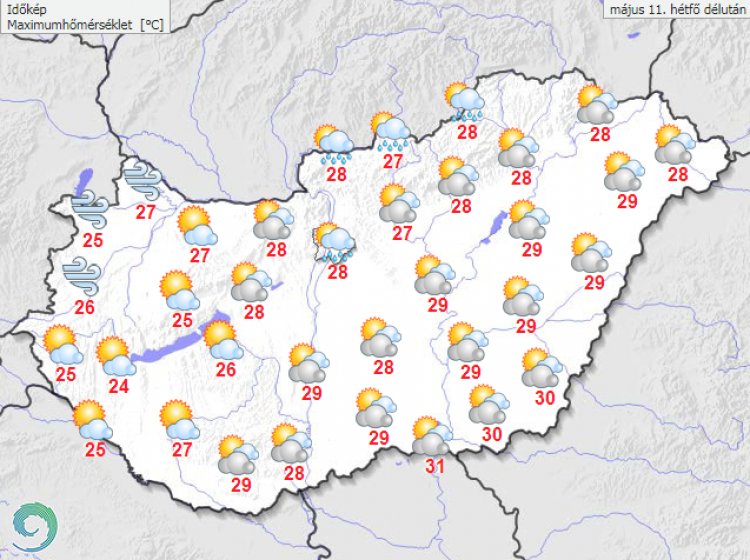 A legmagasabb nappali hőmérséklet 24 és 31 fok között valószínű. Késő estére 18 és 23 fok közé hűl le a levegő.
