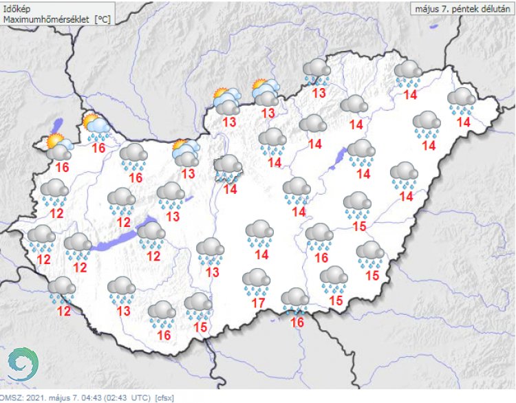 A legmagasabb nappali hőmérséklet általában 13 és 18 fok között alakul, a tartósabban csapadékos délnyugati tájakon azonban ennél kissé hűvösebb is lehet, míg reggel, kora délelőtt a déli határ mentén néhol 18 fok fölötti csúcsérték is előfordulhat. Késő estére 7 és 11 fok közé hűl le a levegő.