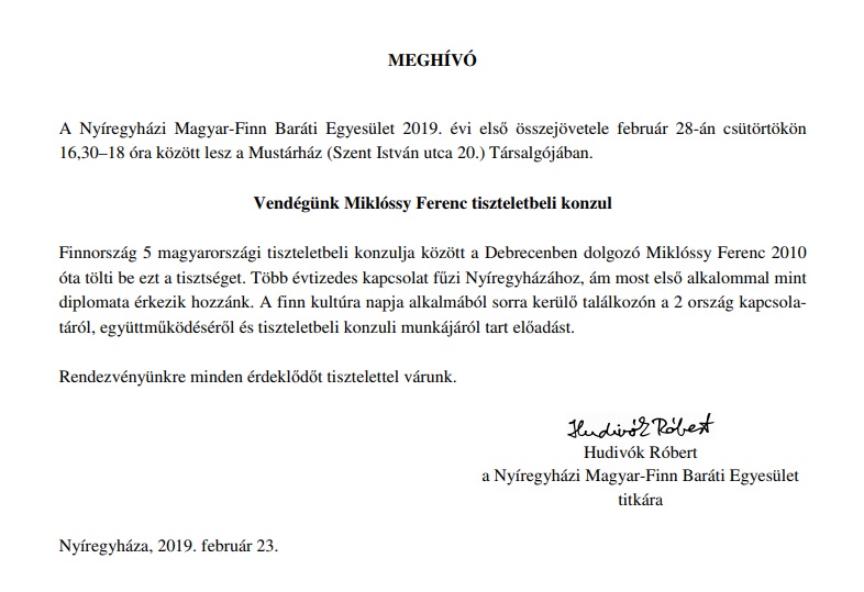 Összejövetelt tart a Nyíregyházi Magyar-Finn Baráti Egyesület