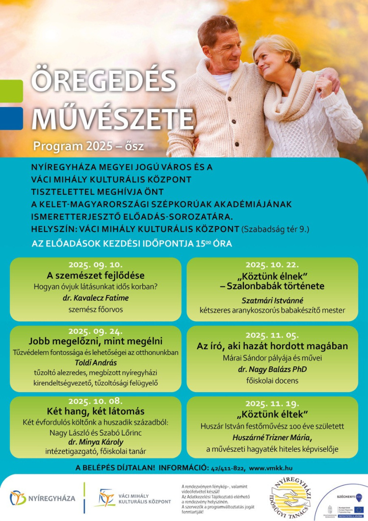 Nyíregyháza MJV Önkormányzata és a Váci Mihály Kulturális Központ idén ősszel is elindítja a Szépkorúak Akadémiáját, amely hat alkalomból álló, kéthetente szerdán délután megrendezett előadássorozattal várja az érdeklődőket.