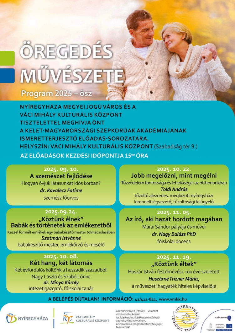 Nyíregyháza MJV Önkormányzata és a Váci Mihály Kulturális Központ idén ősszel is elindítja a Szépkorúak Akadémiáját, amely hat alkalomból álló, kéthetente szerdán délután megrendezett előadássorozattal várja az érdeklődőket.