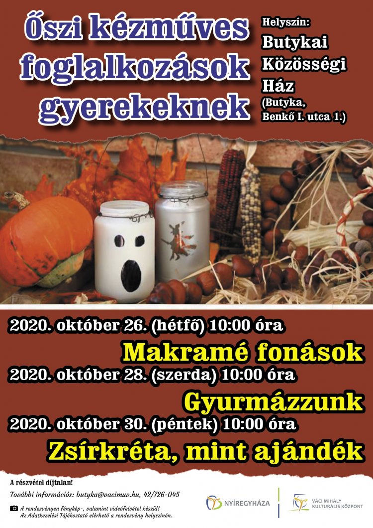 Kreatív elfoglaltság várja a gyerekeket október 26-án, 28-án és 30-án a Butykai Közösségi Házban. A foglalkozások ingyenesek.