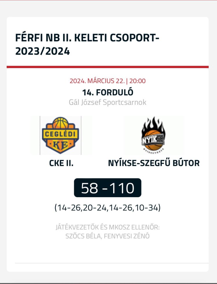 Cegléden lépett pályára a férfi kosárlabda NB-II Keleti csoportjában a NYÍKSE - Szegfű Bútor. Betegségek és elfoglaltságok miatt mindössze öt játékos utazhatott el a meccsre, azaz csere nélkül játszottak végig a mieink, de így is nagy különbséggel győztek!