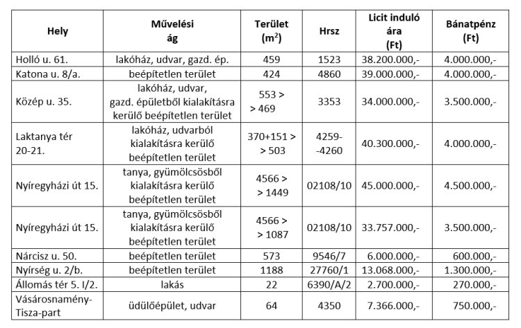 Nyíregyháza Megyei Jogú Város Önkormányzata vagyonának meghatározásáról, a vagyon feletti tulajdonjog gyakorlásának szabályozásáról szóló 48/2012. (XII.14.) önkormányzati rendeletének vonatkozó paragrafusai, továbbá a rendelet 3. számú mellékletének, a Versenyeztetési Szabályzat vonatkozó pontjai alapján nyílt, kétfordulós pályázati eljárás keretében értékesítésre meghirdeti az Önkormányzat tulajdonában álló alábbi ingatlanokat: