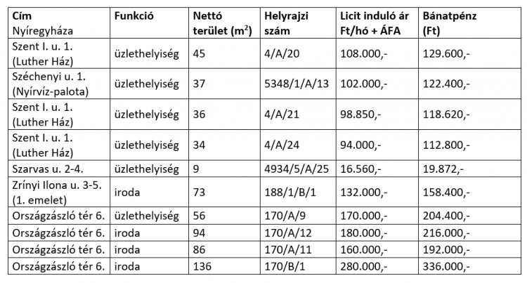 Nyíregyháza Megyei Jogú Város Polgármesteri Hivatala Vagyongazdálkodási Osztálya (4400 Nyíregyháza, Kossuth tér 1.) kétfordulós, nyilvános pályázat keretében bérbeadás útján történő hasznosításra meghirdeti az alábbi ingatlanokat.
