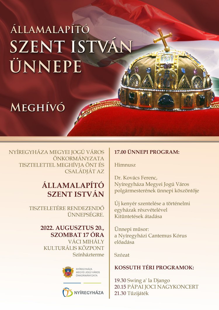 Nyíregyháza Megyei Jogú Város Önkormányzata államalapító Szent István tiszteletére 2022. augusztus 20-án (szombaton) 17 órától ünnepséget rendez a Váci Mihály Kulturális Központ színháztermében, majd a Kossuth téren.