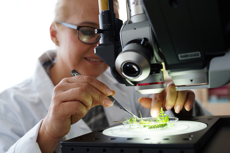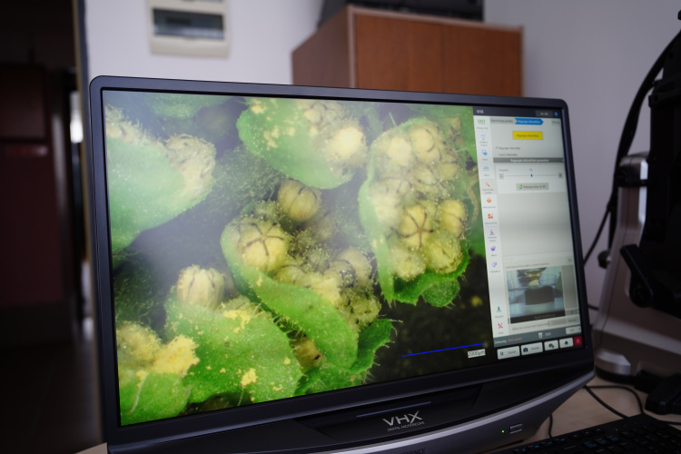 Dobróné Dr. Tóth Márta, főiskolai tanár a Hitachi S800 típusú elektronmikroszkóppal, valamint a 2025-ben beszerzett Keyens 4K digitális mikroszkóppal is vizsgálja a parlagfű-mintákat