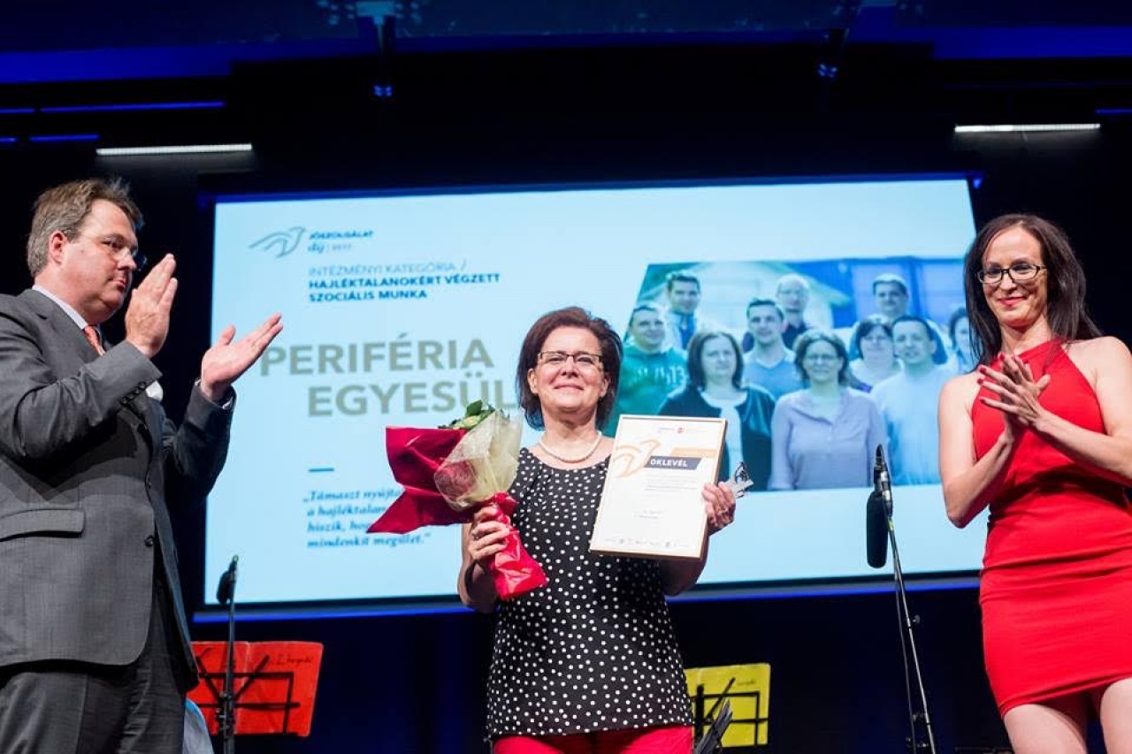Egy trolibuszvezető, egy közmunkás, egy plébános és többek között intézmények. Ők vehették át idén a Várkert Bazár Rendezvénytermében a Jószolgálati-díjakat. Az pedig külön büszkeség nekünk, nyíregyháziaknak, hogy a szakmai zsűri a Periféria Egyesület áldozatos munkáját is elismerte: a hajléktalanokért végzett szociális munka intézményi kategóriában ők hozhatták haza az első díjat. (Megjelent a Nyíregyházi Napló 2017. június 9-ei számában)A Twickel-Zichy Mária Terézia Alapítvány által 2016-ban alapított díj azokat a szociális területeken tevékenykedõ professzionális és önkéntes segítõket szeretné évrõl évre elismerni, akik áldozatos és példaértékû munkájukkal sokat tesznek a hátrányos helyzetû társadalmi rétegekért, az ország különbözõ szegmenseiben. Az idei díjakat – 12 kategóriában – május 31-én adták át – köztük a nyíregyházi Periféria Egyesületnek – Budapesten.