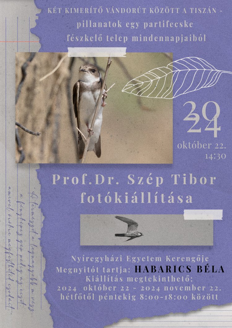 Két kimerítő vándorút között a Tiszán – pillanatok egy partifecske-fészkelőtelep mindennapjaiból címmel nyílik fotókiállítás a Nyíregyházi Egyetemen október 22-én 14.30-tól. A kiállítást Habarics Béla Hortobágyi Nemzeti Park természetvédelmi őrszolgálatvezető-helyettese, tájegységvezetője nyitja meg.