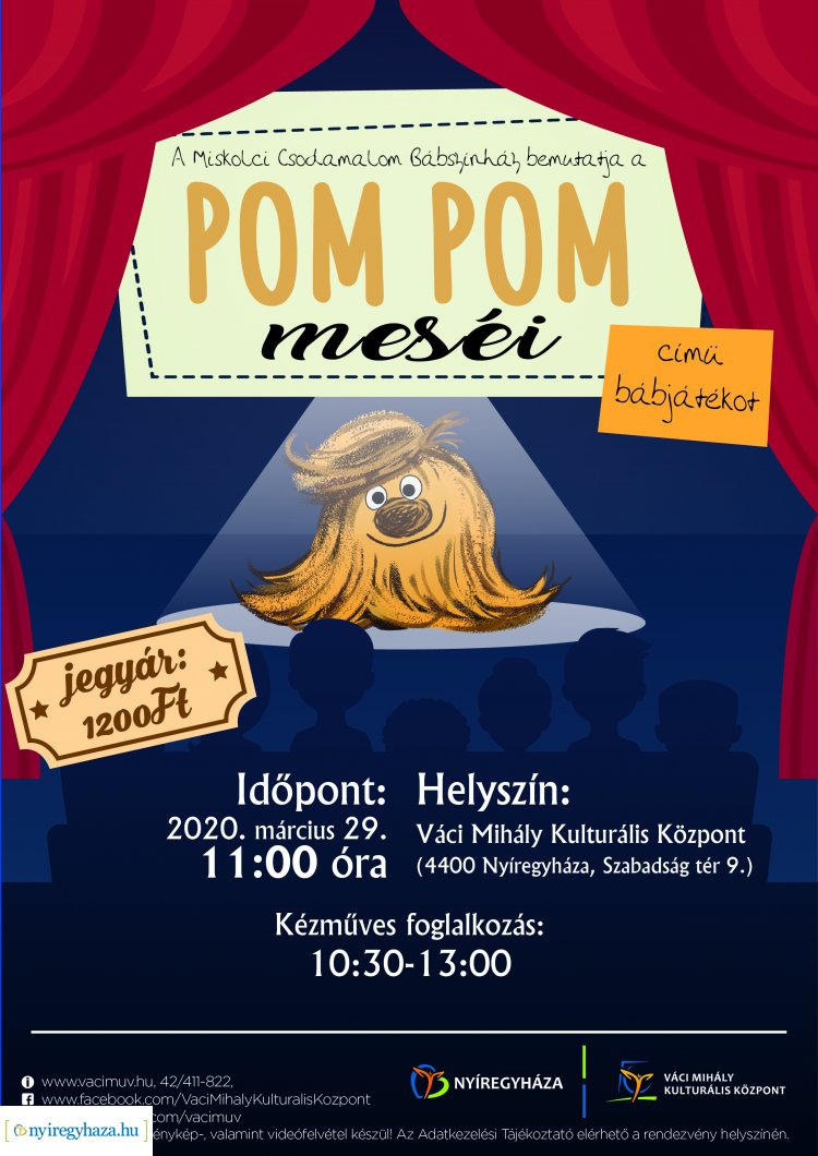 Pom Pom meséi elevenednek meg a Miskolci Csodamalom Bábszínház előadásában március 29-én Nyíregyházán, a Váci Mihály Kulturális Központban. A bábjáték mellett kézműves foglalkozás is várja a gyerekeket.