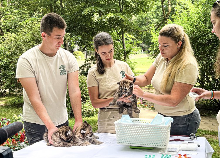 – A puma hármas ikrek egy hónapja születtek a Nyíregyházi Állatparkban, most volt az első állatorvosi vizsgálatuk. Teljesen egészségesek, koruknak megfelelően fejlődnek. Bundájuk jelenleg foltos, ahogy ennek lennie is kell, majd később veszik fel azt az egységes barna színezetet. Teljesen egészségesen fejlődnek, a pocakjukon is látszik, hogy tele vannak anyatejjel, és mindhárman hímek – mondta el dr. Biácsi Alexandra, a Nyíregyházi Állatpark állatorvosa.