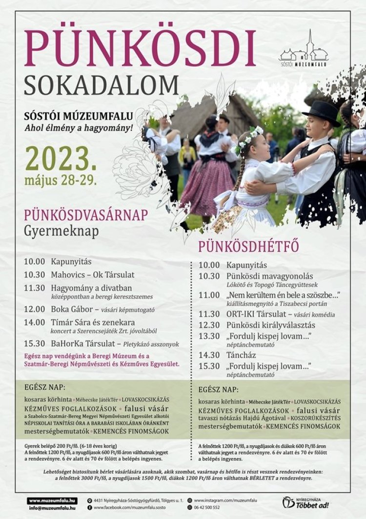 Május utolsó hétvégéjén, régi szokás szerint hagyományos pünkösdi sokadalomra hívnak és várnak minden érdeklődőt a Sóstói Múzeumfaluba! Mindkét napon 10 órakor nyitják a kapukat.