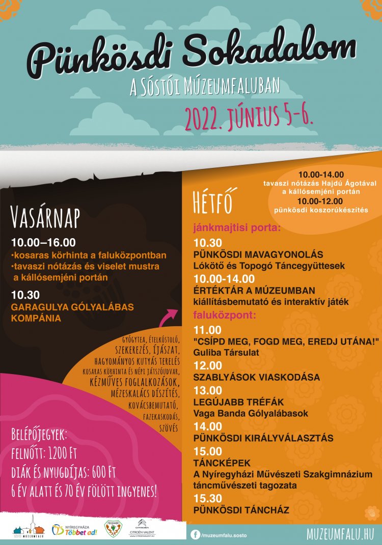Pünkösdvasárnap a Garagulya Gólyalábas Kompánia műsora 10.30-kor a faluközpontban várja a család minden tagját. 10.00 és 16.00 óra között a kállósemjéni portánkon hagyományos öltözetekkel ismerkedhetnek vendégeink, illetve együtt nótázhatnak Hajdu Ágotával, a faluközpontban pedig hagyományos kosaras körhinta várja a szórakozni vágyókat.