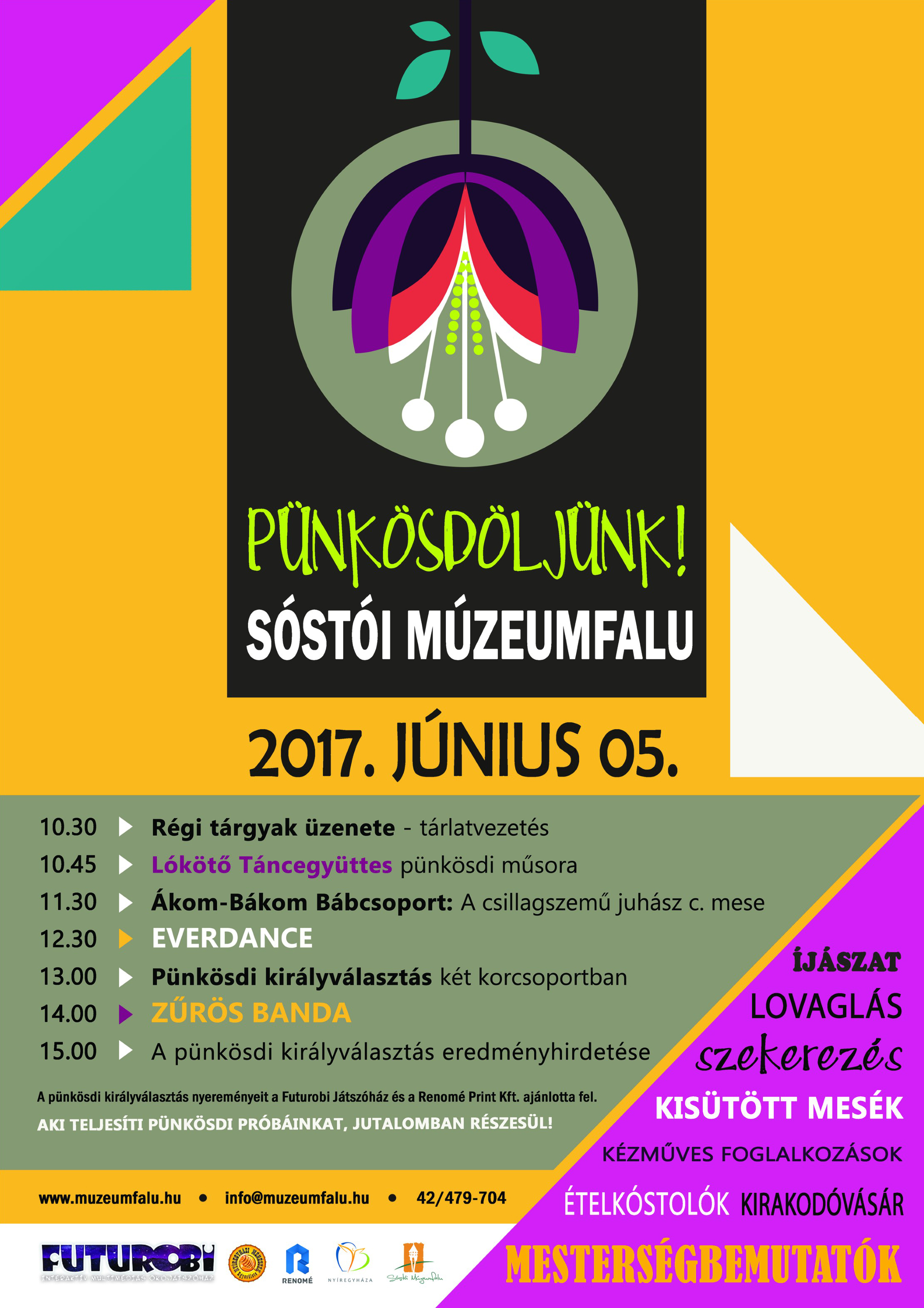 Zöld ágakkal díszített kapufélfák, ünnepi díszbe öltöztetett templom várja 2017. június 5-én a látogatókat a Sóstói Múzeumfaluban. A hagyományoknak megfelelően néptáncosok közreműködésével felelevenítik a pünkösdi népszokásokat, többek között ügyességi próbákkal megválasztják az új pünkösdikirályt, akit kiváltságai egy évig illetnek meg.
