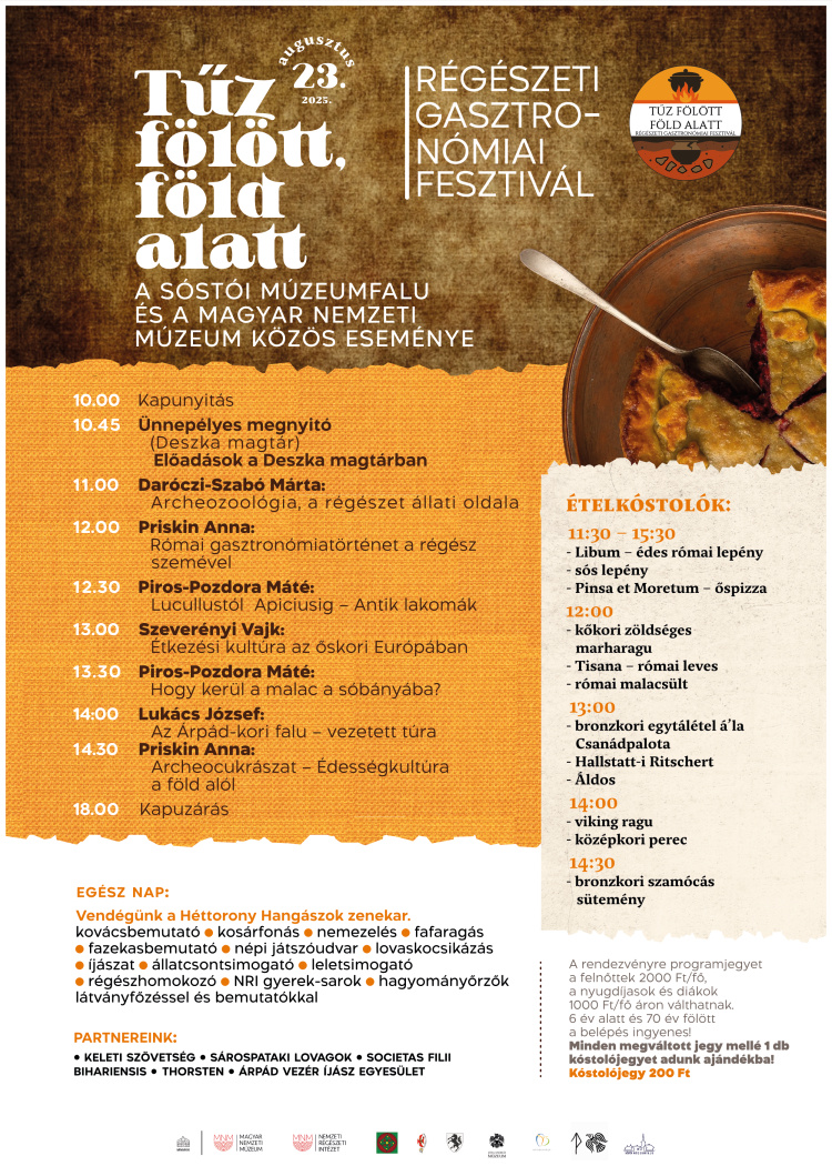A régészet és a gasztronómia találkozása különleges élményt ígér Nyíregyházán: 2025. augusztus 23-án a Sóstói Múzeumfaluban megrendezésre kerül a Tűz fölött, föld alatt -Régészeti Gasztronómiai Fesztivál. A rendezvény szervezői a Magyar Nemzeti Múzeum Közgyűjteményi Központ Nemzeti Régészeti Intézet és a Sóstói Múzeumfalu.