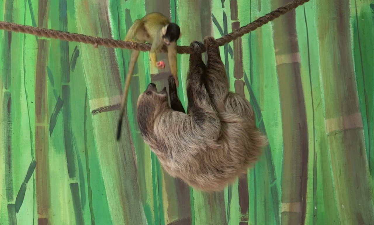 A lajhárokkal társbérletben élő bolíviai mókusmajmok, a lassúságot kihasználva, olykor finom falatokat csennek el a szomszédaiktól...