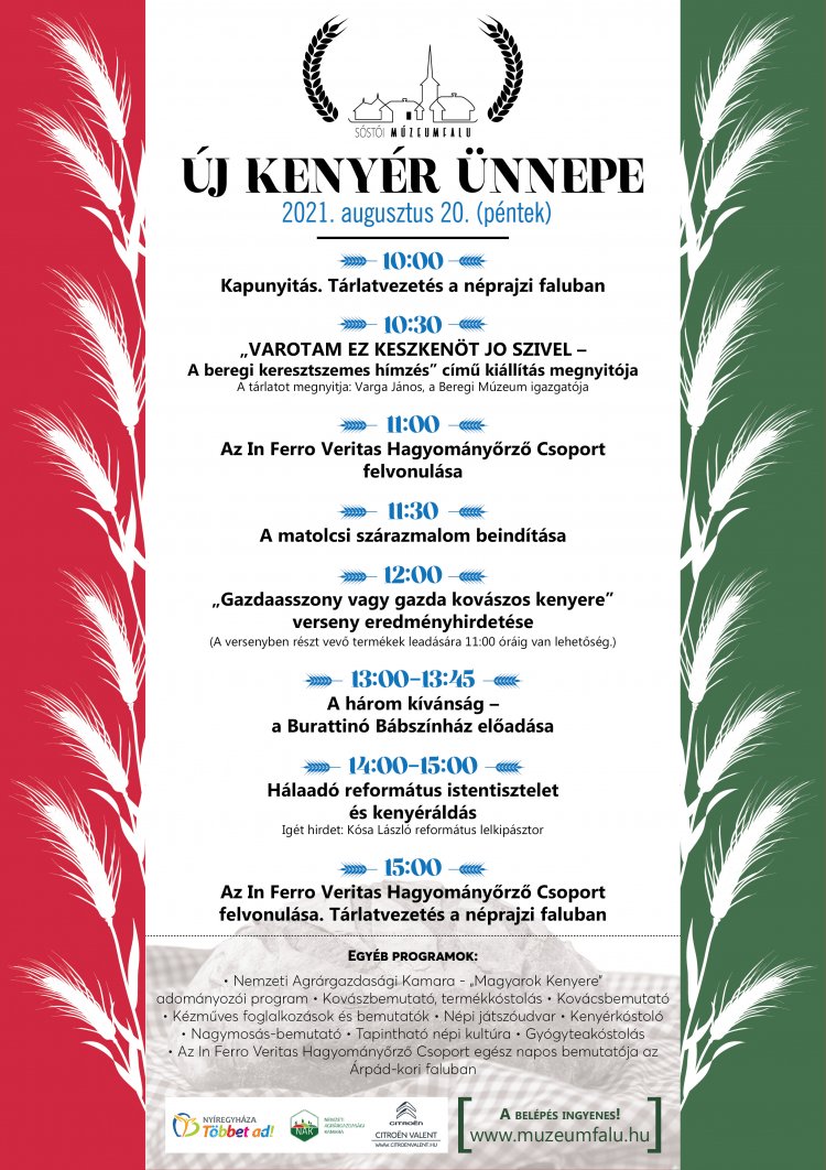 S napközben a Sóstói Múzeumfaluban is sorjáznak az ünnepi programok. Az új kenyér ünnepén felelevenítik a hagyományokat: beindítják a matolcsi szárazmalmot, és felvonul az „In Ferro Veritas” középkori hagyományőrző csoport, akik egész napos bemutatóval várják a látogatókat az Árpád-kori faluban. Kihirdetik a „Gazdaasszony vagy gazda kovászos kenyere” elnevezésű verseny győztesét, a gyermekeket pedig a Burattinó Bábszínház előadása és a kenyér élettörténetét bemutató interaktív játék várja, de lesz körhinta és népi játszóudvar is. A program részeként, a hagyományoknak megfelelően a faluközpontban hálaadó református istentiszteletet tartanak. Igét hirdet Kósa László református lelkipásztor. Az istentiszteletet az új kenyér megáldása és kóstolója követi. Megnyílik a múzeumfalu új időszaki kiállítása is „Varotam ez keszkenöt jo szivel – A beregi keresztszemes hímzés” címmel. A látogatók kézműveskedhetnek is: lehetőség lesz szövésre, gyertyamártásra, nemezelésre, bőrözésre, illatzsák és szalmadísz készítésére, fazekaskodásra, vagy akár gyógyteakóstolásra is. A műhelyekbe újra élet költözik, láthatják, hogyan dolgozik a kovács, a mézeskalács-készítő, a kádár, és hogy hogyan zajlott a nagymosás. A múzeumfalu vendégei lesznek a Nemzeti Agrárgazdasági Kamara munkatársai, akik a nap során több száz kiscipót fognak kiosztani a Magyarok Kenyere adományozói program keretében mindazoknak, akik a kenyér útját végigjárják.