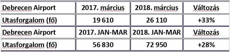 1/3-addal többen, mintegy 26 110-en vették igénybe Magyarország legdinamikusabban fejlődő repülőterét. Ez minden idők legerősebb márciusi és egyben első negyedéves utasforgalma volt a Debrecen Airporton.