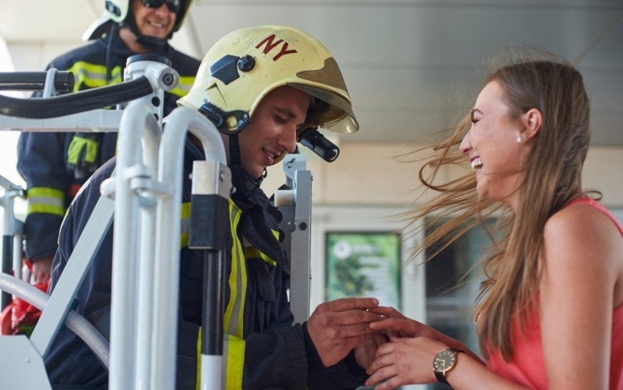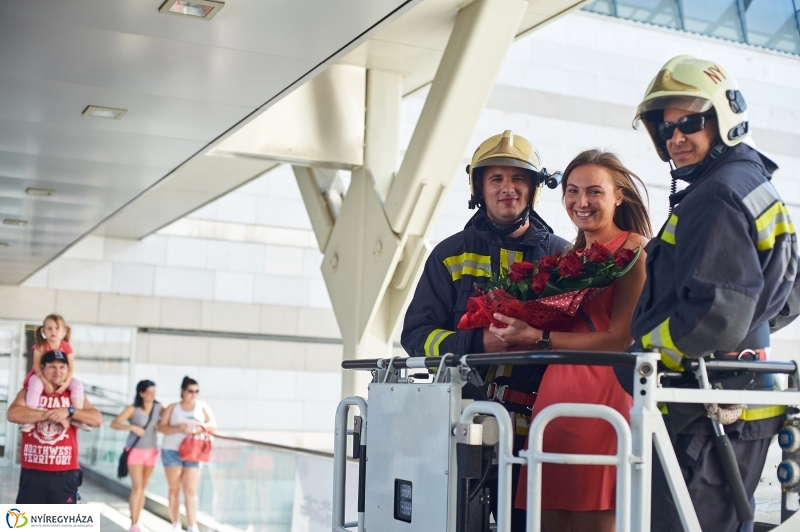 Leánykérés tűzoltó-módra – ez tette felejthetetlenné a szombatot Nyíregyháza belvárosában. Egy szerkocsi és egy emelőkosaras jármű érkezett a belvárosi üzletházhoz, majd rövid szirénázás után a járókelők számára is világosság vált, hogy leánykérés következik!