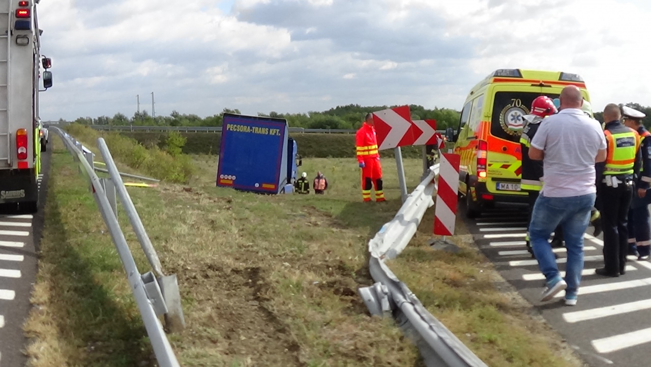Egy kamion sofőrje – feltehetően rosszul lett vezetés közben – így átszakította járműjével a szalagkorlátot és a mély árokba hajtott. A sofőrt a mentők kórházba szállították, a tűzoltók a műszaki mentésben és áramtalanításban segítettek a helyszínen. Az anyagi kár jelentős.