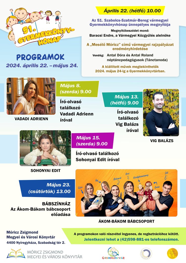 Nyíregyháza április 22-én csatlakozik az 51. Gyermekkönyvhónap programsorozatához. Több írós-olvasó találkozót szerveznek a Móricz Zsigmond Megyei és Városi Könytárban, sőt bábszínház is lesz!
