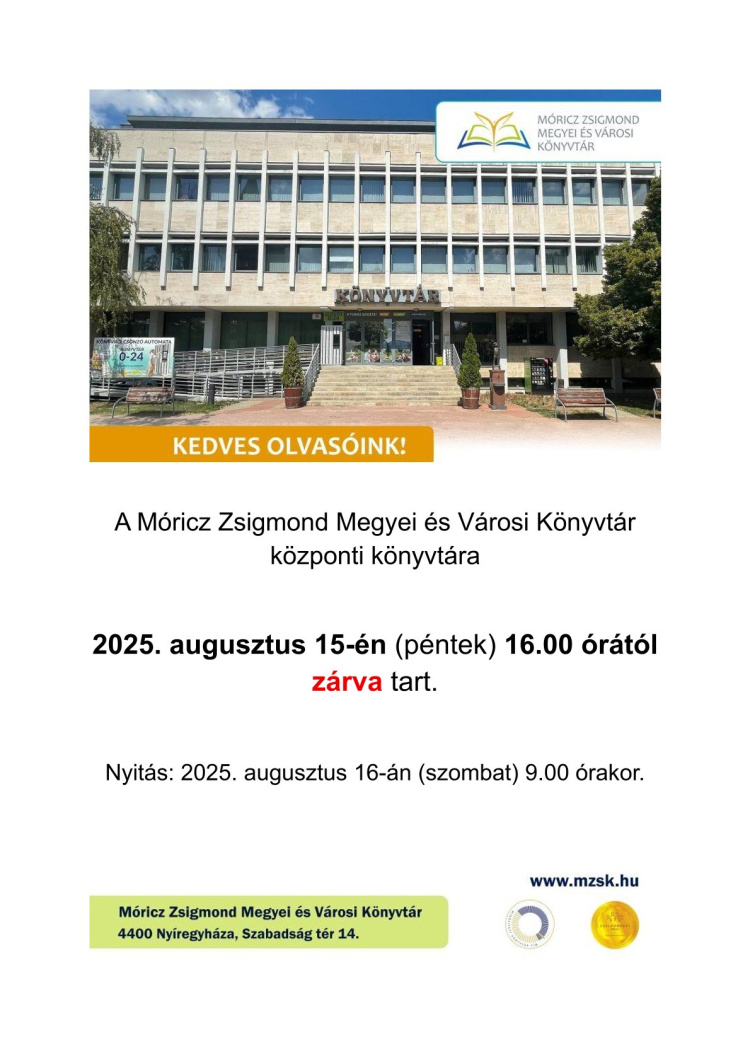 A Móricz Zsigmond Megyei és Városi Könyvtár központi könyvtára 2025.08.15-én (péntek) 16.00 órától zárva tart.