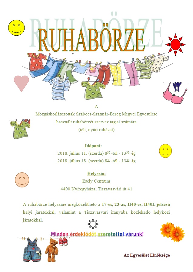 A Mozgáskorlátozottak Szabolcs-Szatmár-Bereg Megyei Egyesülete használt téli, nyári ruházatból ruhabörzét szervez tagjai számára 2018. július 11-én és 2018. július 18-án (szerda) 8.30 óra és 13.30 óra között, melynek helyszíne az Esély Centrum (Nyíregyháza, Tiszavasvári út 41.).