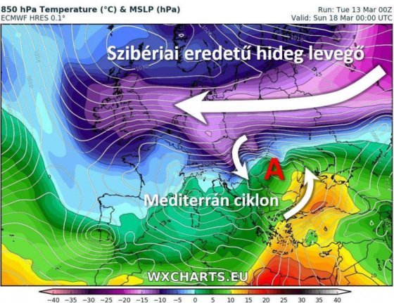 Az enyhe, tavaszias napok után meglehetősen kellemetlen idővel zárul a hosszú hétvége. Szombaton ugyanis egy mediterrán ciklon hoz sokfelé kiadós csapadékot, a ciklon hátoldalán pedig erőteljes északias áramlással hideg, szibériai eredetű levegő zúdul a Kárpát-medencébe:
