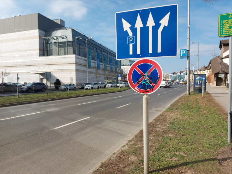 Feltehetőleg ugyanaz a személy, ugyanazzal a módszerrel több KRESZ-táblát is összefirkált a Belső körúton és a Vay Ádám körúton.
