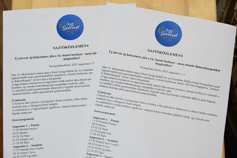 Már javában építik a forgatagi faházakat a NYÍRVV Nonprofit Kft. munkatársai Sóstón, hiszen néhány nap és benépesül a terület. Idén ugyanis immár 14. alkalommal rendezi meg a Sóstó-Gyógyfürdők Zrt. és a Sunshine Média Group Nyíregyháza egyik legkedveltebb nyári gasztrokulturális eseményét, a Sóstó SerFesztet, amely 2025-ben megújulva, SerFeszt és Buboréknapok néven várja a látogatókat augusztus 1-jén, 2-án és 3-án – erről számoltak be sajtótájékoztató keretében a szervezők. Az eseményen elhangzott, idén nemcsak új névvel, de új helyszínen is várják az érdeklődőket: hiszen a fesztivál Sóstó szívében, a zenélő szökőkúttól a Parkfürdő bejáratáig elterülő részen várja a kikapcsolódni vágyókat.