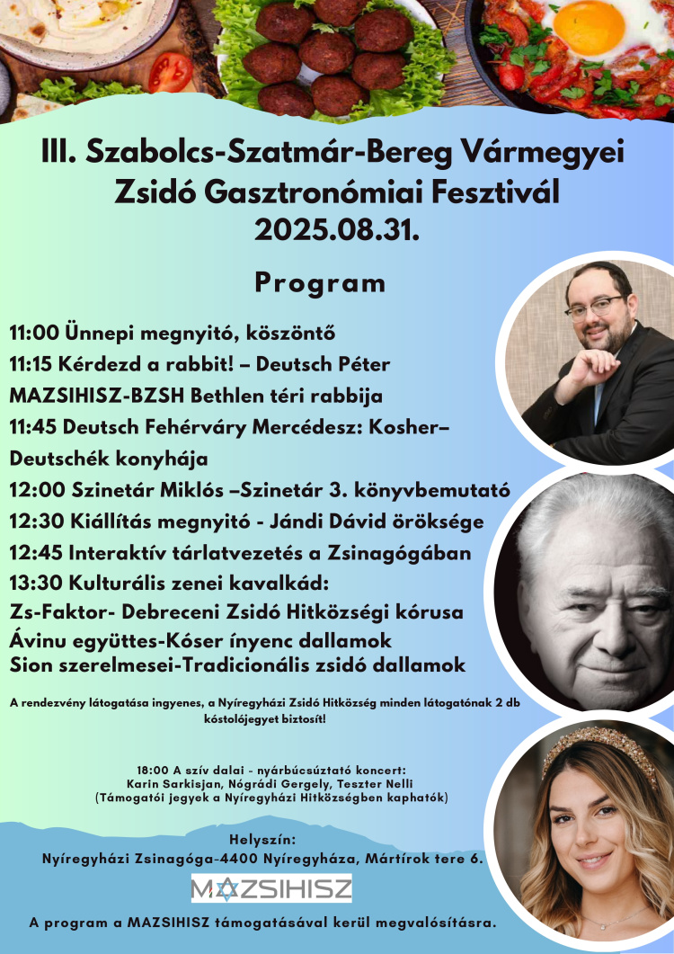 A harmadik Szabolcs-Szatmár-Bereg Vármegyei Zsidó Gasztronómiai Fesztiválra augusztus 31-én kerül sor.
