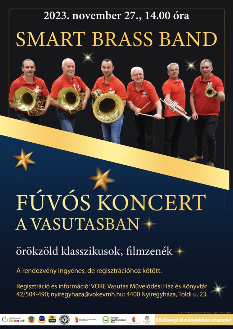 A Smart Brass Band 2023. november 27-én, (hétfőn) 14.00 órától ad fúvós koncertet a Vasutasban.
