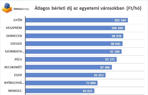 A legdrágább város e tekintetben Győr, ahol 103 ezer forintos havidíj ellenében bérelhet egy fiatal lakást. Ezt követi Veszprém, Debrecen és Szeged, ahol nagyjából havi százzer forintot kérnek a bérbeadók, természetesen a teljes lakhatási költséghez hozzá kell még számolni a rezsit is. A skála másik végén Nyíregyháza és Miskolc helyezkedik el, ahol már 70 ezer forint környékén ki lehet bérelni egy egyetemi hajlékot.
