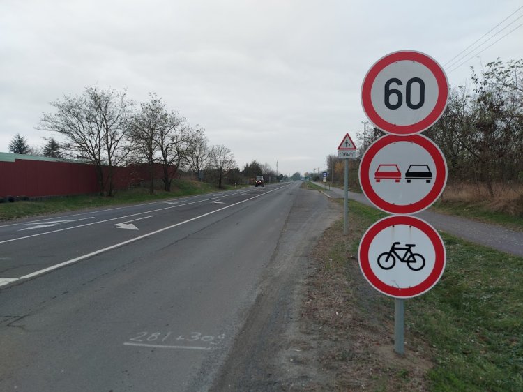 Előzni tilos és 60 km/h-s sebességkorlátozó táblákat szerelt fel a Magyar Közút Nyíregyházi Üzemmérnöksége a 4-es főúton, Nyírpazonynál.