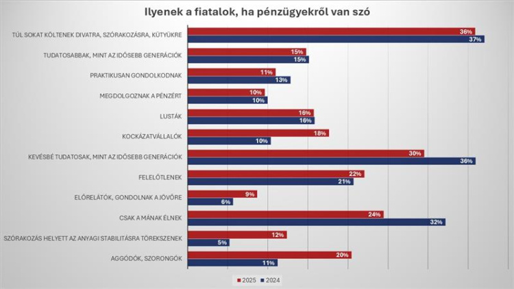 Kedvezőtlen változást mutat ugyanakkor, hogy a múlt évi felméréshez képest közel a duplájára nőtt azok aránya, akik a pénzügyek terén aggódónak, szorongónak tartják a fiatalokat: immár minden ötödik válaszadó van ezen a véleményen. A 16-29 éves korosztályban szintén a kétszeresére nőtt azok aránya, akik a saját korosztályukat aggódónak, szorongónak látják. Ez a növekedés egyúttal azt is jelenti, hogy ebben a generációban immár ezt tartják a leginkább jellemző tulajdonságnak magukra nézve, hiszen 10-ből 4-en vannak ezen a véleményen.
