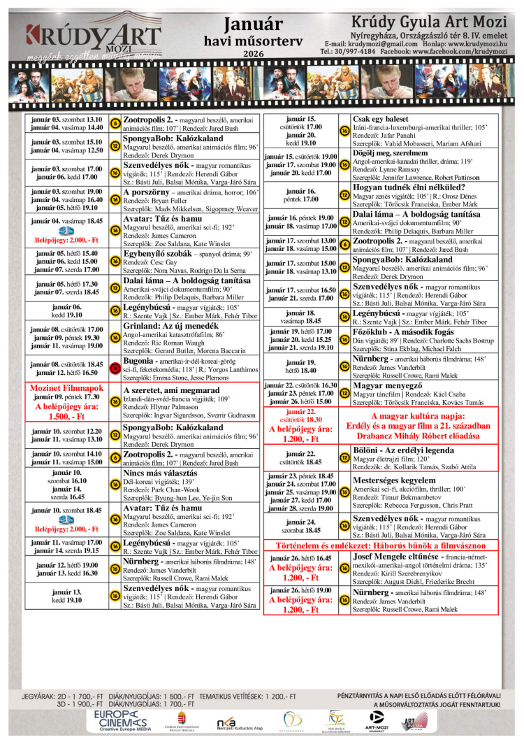 Gazdag és változatos programmal várja a filmkedvelőket 2026 januárjában a Krúdy Gyula Art Mozi. A hónap műsorterve a legkisebbektől a művészfilmek rajongóin át egészen a történelem és dokumentumfilmek iránt érdeklődőkig minden korosztályt megszólít.
