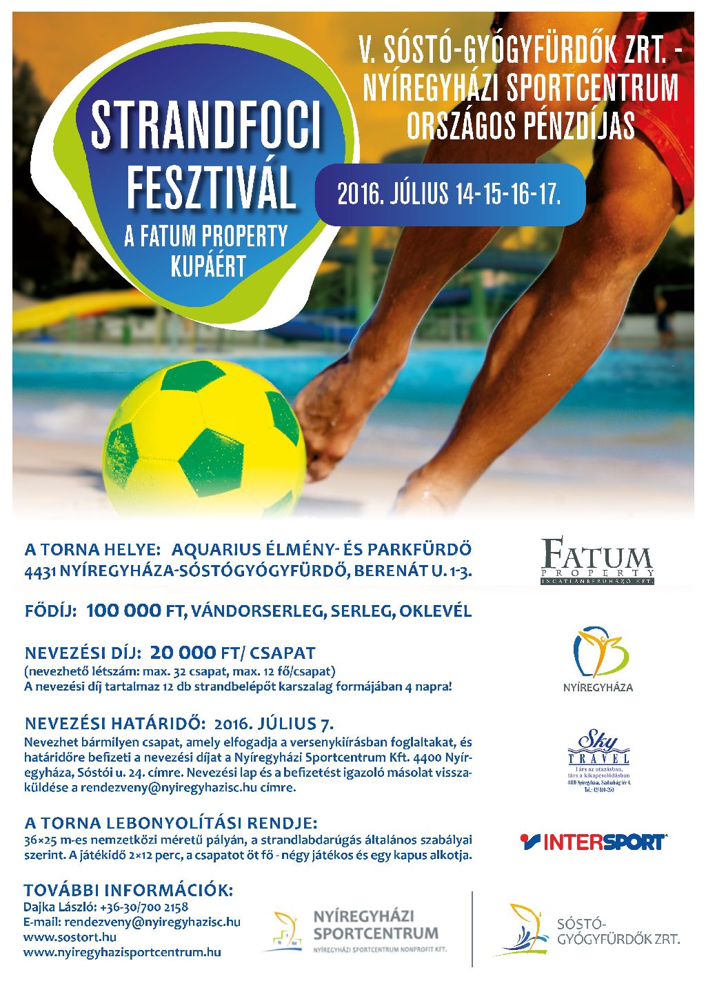 Július elején ismét megrendezik Sóstón a hagyományos strandfoci tornát. 40 férfi- és 6 női csapat vesz részt. Az ország különböző pontjairól érkeznek együttesek.Ha nyár, akkor strandfoci Sóstón. Idén már ötödik alkalommal rendezik meg a Sóstó-Gyógyfürdők–Nyíregyházi Sportcentrum országos pénzdíjas tornát a Fatum Poperty Kupáért. Nevezni már lehet, sőt érdemes is, mivel 40 csapatot fogadnak a szervezők, és sokan már jelentkeztek.