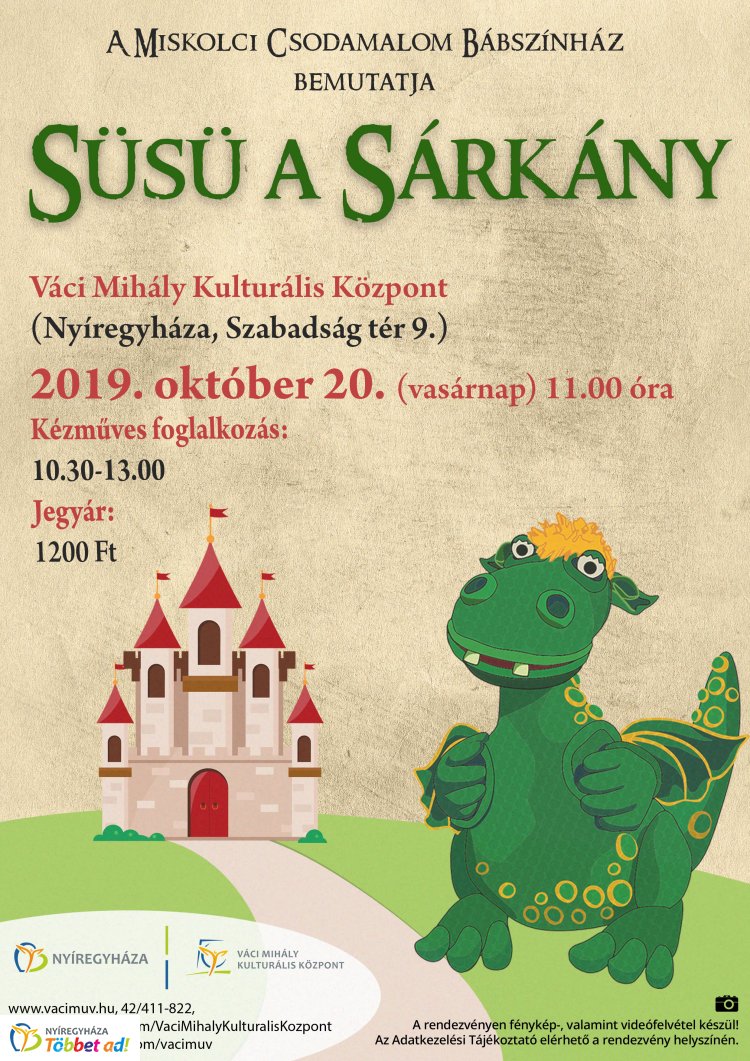 A Miskolci Csodamalom Bábszínház a Süsü a sárkány előadásával érkezik október 20-án Nyíregyházára, a Váci Mihály Kulturális Központba. A bábelőadás mellett kézműves foglalkozás is várja a családokat.