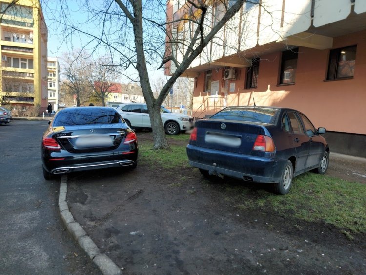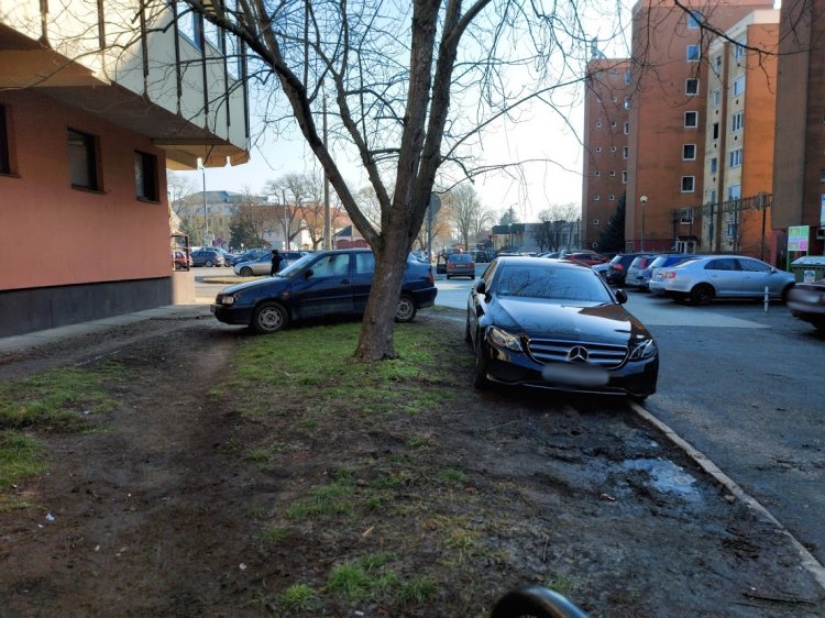 A Szent István utca végén több személyautó is szabálytalanul, a zöld területen parkol.