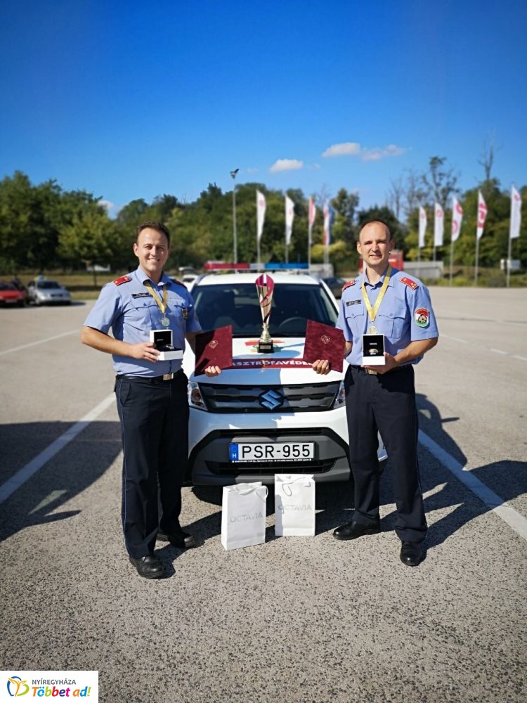 Az országos versenyen a dobogó legfelső fokára Oszlár Gábor tű. százados, a Nyíregyházi Hivatásos Tűzoltóparancsnokság parancsnokhelyettese, valamint Bodnár Gábor tű. hadnagy, a Nyíregyházi Katasztrófavédelmi Kirendeltség Hatósági Osztályának főelőadója állhatott.